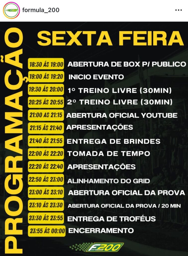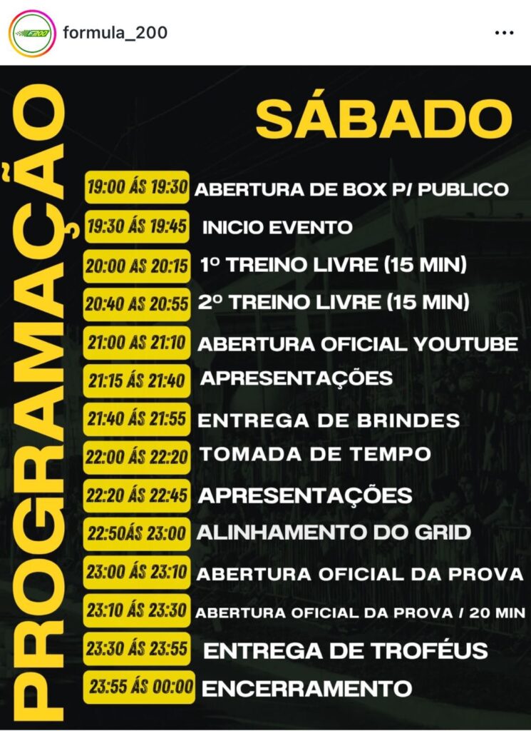 Já no sábado, dia 25, a programação começa às 19h, com treinos livres mais curtos e sequência de atrações até a corrida principal, que também acontece no fim da noite. A entrega de troféus e o encerramento marcam o fechamento do evento.